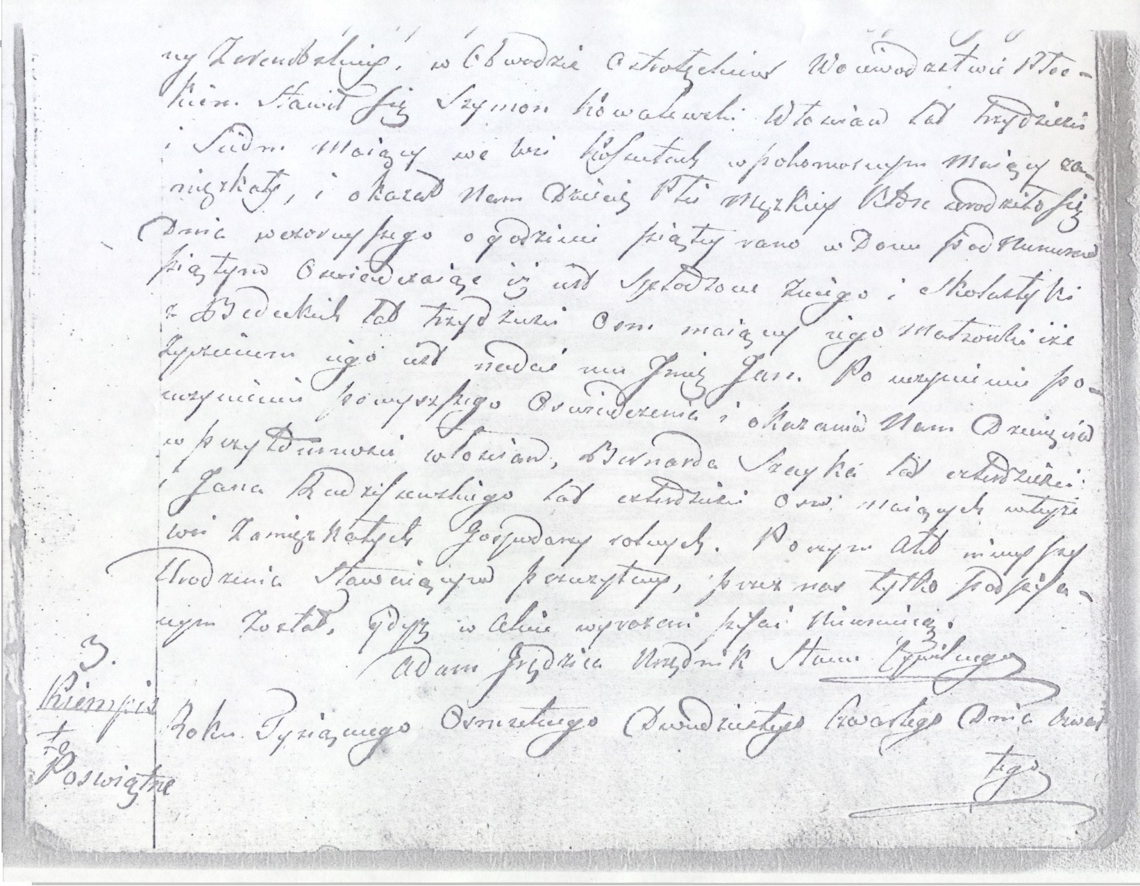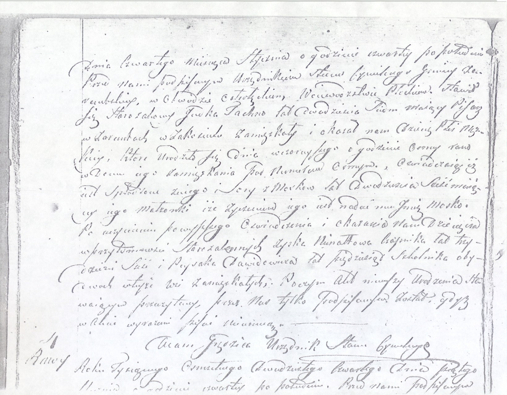 The year eighteen hundred and twenty four, January the fourth at four o'clock in the afternoon. Before Us, the undersigned Holder of the Civil Records of the municipality of Zaremby in the district of Ostroleka, voivodship Plock, appeared the Jew Joska [Yosef son of Boruch Dov Ha-Levy] Tachno (Tachna), twenty seven years old, scribe, residing in Zaremby in Zakosciele, and showed us a child of male gender that was born yesterday at eight o'clock in the morning in his house, number eight, testifying that it was begotten by him and his wife, Sora z Mosków*, twenty six years old, and that it is his wish to give it the name Mosko [Moshe son of Yosef Ha-Levy].  After having made this testimony and having presented Us the child in the presence of the witnesses, Zysek Nienaltow, cap-maker, thirty six years old, and Peysak Dawidowicz, fifty years old, synagogue sexton, both of whom residing in the same village, this birth certificate was read to those who appeared and signed only by Us, as those who mentioned in the document cannot write.