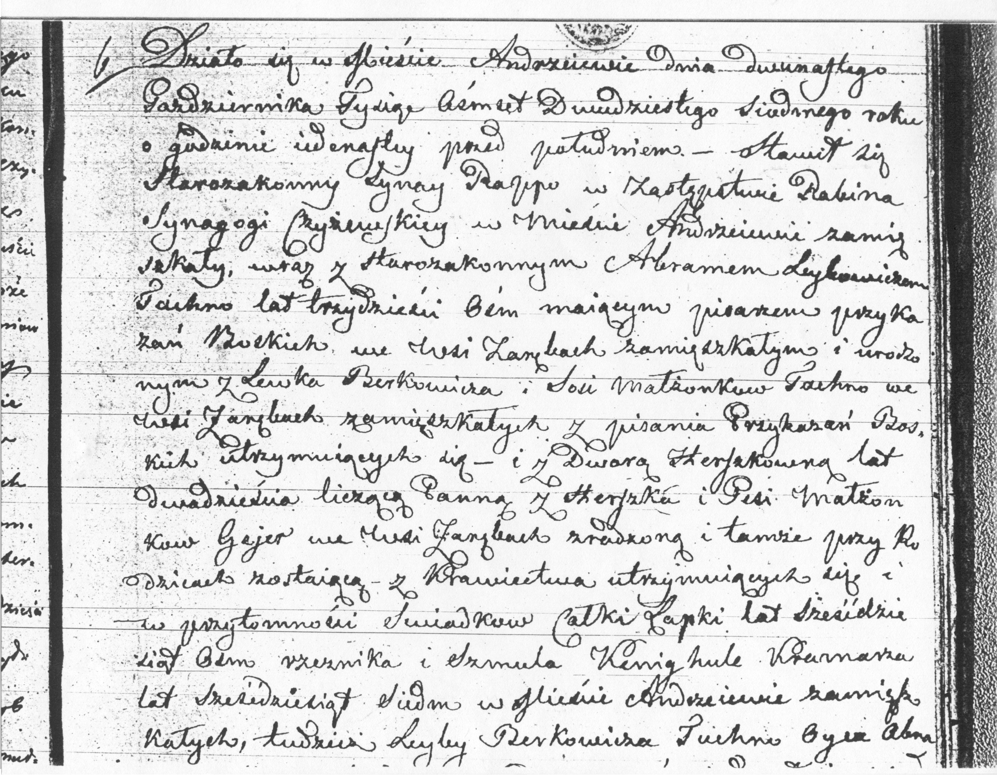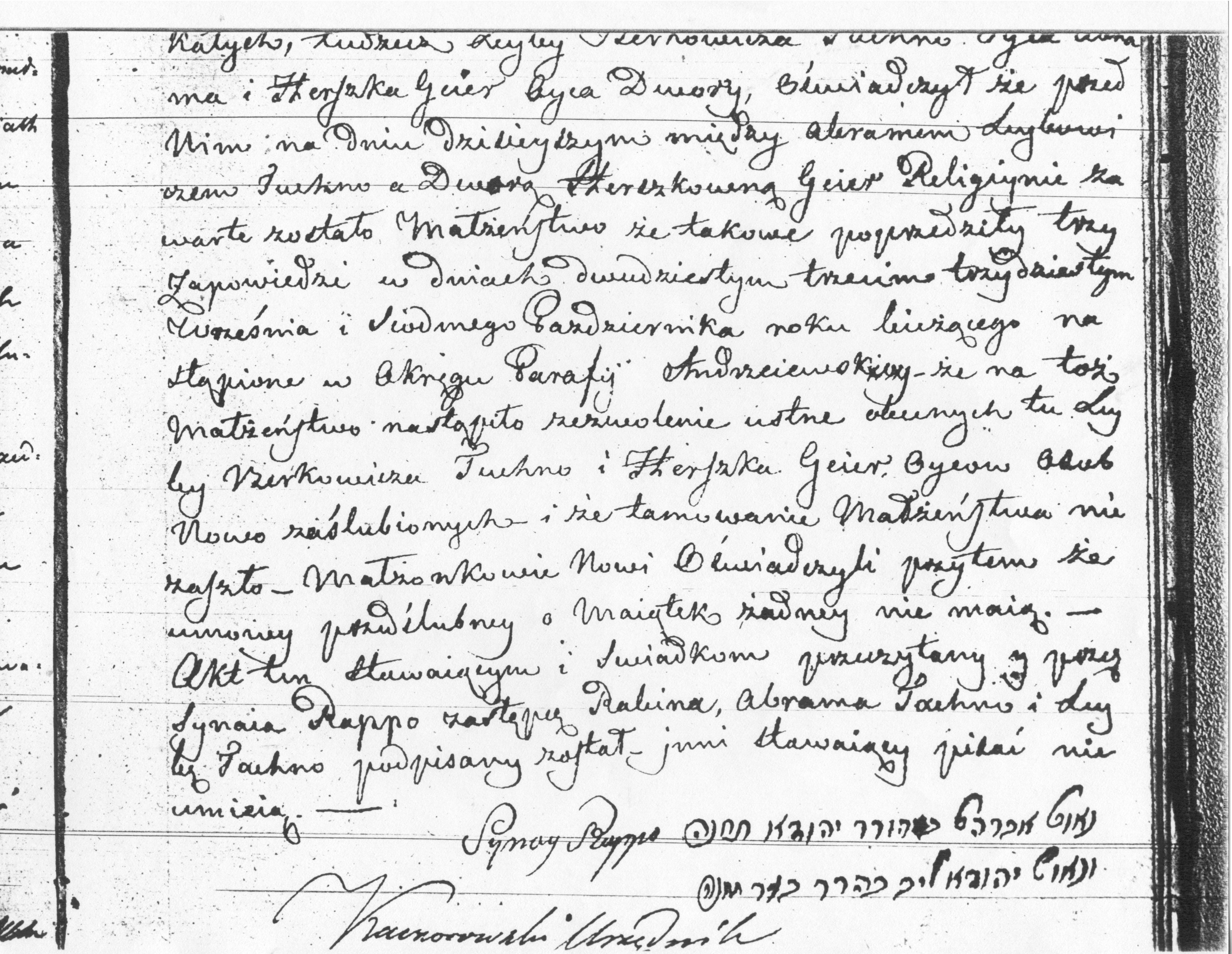 It happened in the town of Andrzejewo on the twelfth of October, eighteen hundred twenty seven at eleven o’clock before noon.  Replacing the Rabbi of the Czyzew synagogue, the Jew Synay Rappo, residing in the town of Andrzejewo, appeared together with the Jew Abram Leybowicz Tachna, age thirty eight, scribe of G-d’s Commandments [Torah Scribe], born and residing in the village of Zareby Koscielne, son of Lewko [Aryey] Berkowicz and Sosia the married couple Tachna, residing in the village of Zareby Koscielne, earning their living from the writing of G-d’s Commandments – and Dwora [Devorah] Herszkowna, age twenty, unmarried, daughter of Herszko and Pesa married couple Gajer, born in the village of Zareby Koscielne, and living there with her parents, who earn their living from tailoring, and in presence of the witnesses Calka Lapka, age sixty eight, butcher, and Szmul Kenighule, a stall-keeper, age sixty seven, both residing in the town of Andrzejewo, as well as in the presence of Leyba Berkowicz Tachna, father of Abram, and Herszko Gejer, father of Dwora, and testified, that today the religious wedding of Abram Leybowicz Tachna and Dwora Herszkowna Gajer was performed before him, and that it preceded three banns on the twenty third and thirtieth of September, and the seventh of October of the current year in the district parish of Andrzejewo, and that permission was given to this wedding personally by Leyba Berkowicz Tachna and Herszko Gajer, the fathers of the newly married, and that no obstruction against the marriage has occurred.  The newly married testified that they do not have any pre-marital contract on their possessions.  This document was read to those who appeared, and signed by Synay Rappo, substitute of the Rabbi, Abram Tachna and Leyba Tachna, whereas the others here present cannot write.