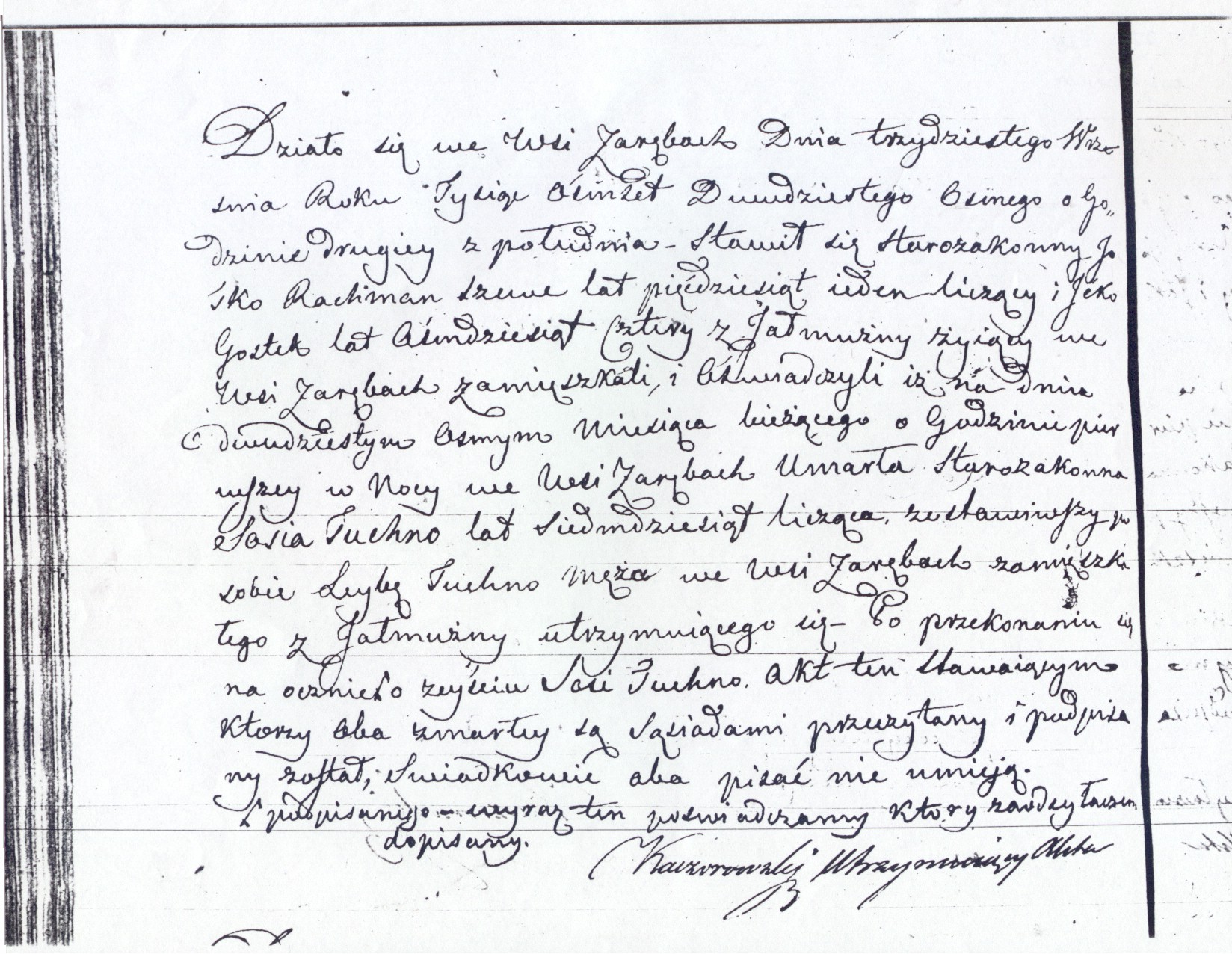 It happened in the village of Zareby Koscielne on the thirtieth of September, eighteen hundred twenty eight at two o’clock in the afternoon.  The Jew Josko Rachman, shoemaker, age fifty one, and Icko Gostek, age eighty four, earning his living from alms, both residing in the village of Zareby Koscielne, appeared and testified, that on the twenty eighth of the current month at one o’clock at night in the village of Zareby Koscielne died the Jew Sosia Tachna, age seventy, leaving her husband Leyba Tachna, residing in the village of Zareby Koscielne, earning his living from alms.  After having convinced myself with my own eyes of the death of Sosia Tachna, this document was read to the witnesses, who both are neighbors of the deceased, and signed; both the witnesses cannot write.