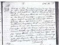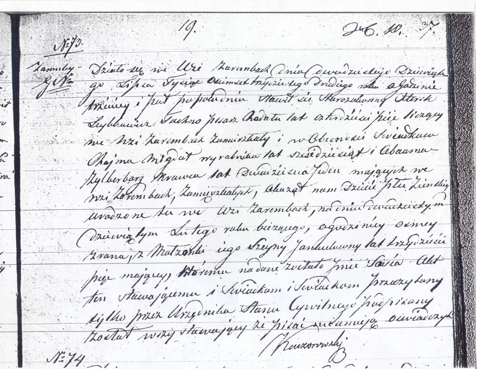 It happened in the village of Zareby Koscielne on the twenty ninth of July, eighteen hundred thirty two at half past three in the afternoon.  The Jew Hersk Leybkowicz Tachna, Rodal scribe [Scribe of Torah Scrolls], age forty five, residing in the village of Zaremby, appeared in the presence of the witnesses Chaim Migdal, day laborer, age sixty, and Abraam Zylberberg, tailor, age twenty one, both of whom are residing in the village of Zaremby, and showed us a child of female gender, born in the village of Zaremby on the twenty ninth of February of the current year at eight o’clock in the evening, to his wife Szeyna Jankielowna, age thirty five, to whom was given the name Sosia.  This document was read to those, whom appeared, and signed only by the Holder of the Vital Records, whereas all those present testified that they cannot write.