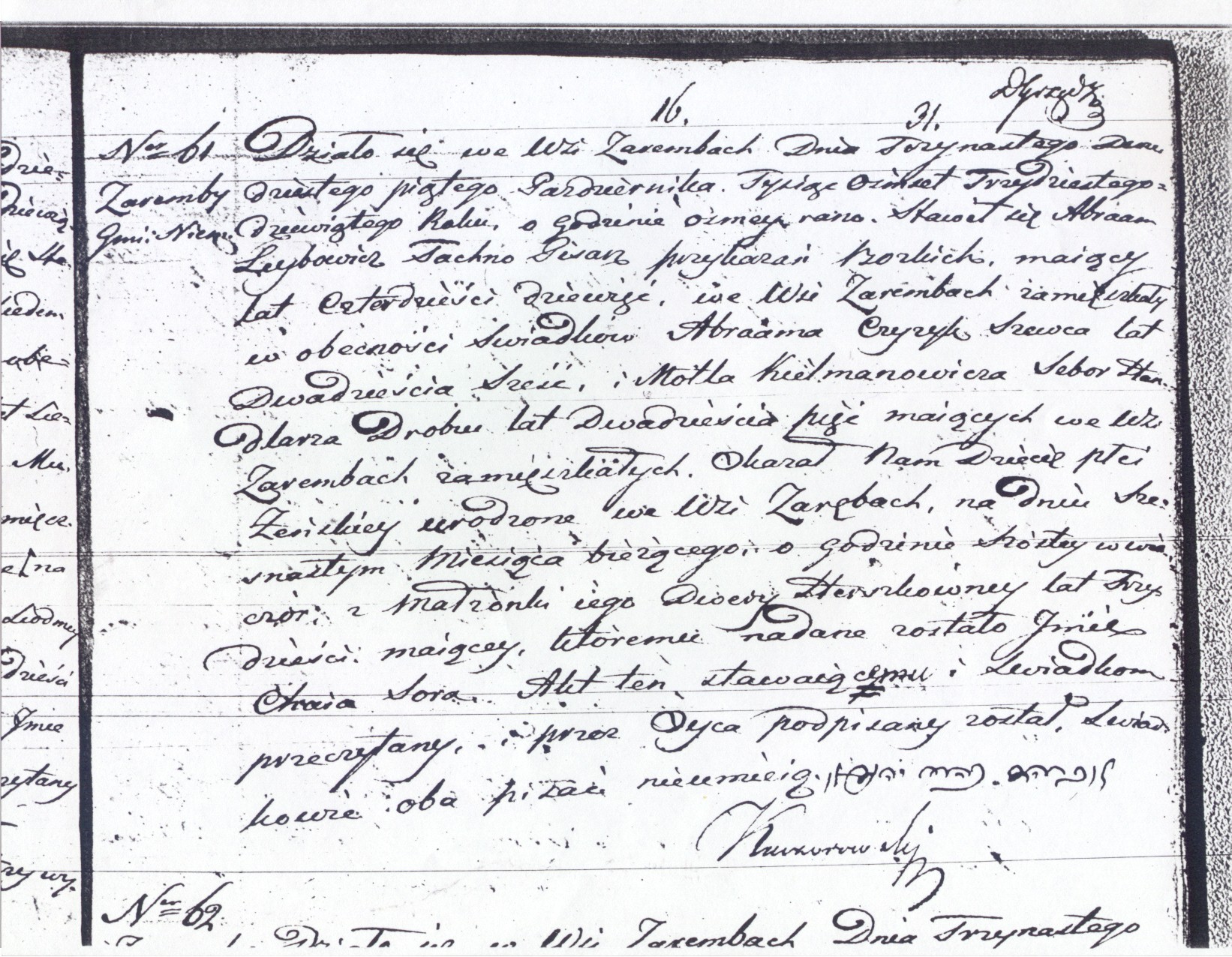 It happened in the village of Zaremby on the thirteenth/twenty fifth of October, eighteen hundred thirty nine at eight o’clock in the morning.  The Jew Abraam [Avraham] Leybowicz Tachna, scribe of G-d’s Commandments [Torah Scribe], age forty nine, residing in the village of Zaremby, appeared in the presence of the witnesses Abraam Czyzyk, shoemaker, age twenty six, and Motel Kielmanowicz Sebor, poulterer, age twenty five, both of whom are residing in the village of Zaremby, and showed us a child of the female gender born in the village of Zareby Koscielne on the sixteenth of the current month, at six o’clock in the evening, to his wife Dwere [Devorah] Herszkowna, age thirty, to whom was given the name Chaia Sora [Chaya Sara].  This document was read to those who appeared and signed by the father, whereas both the witnesses cannot write.