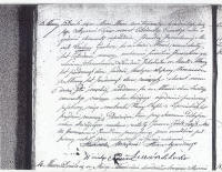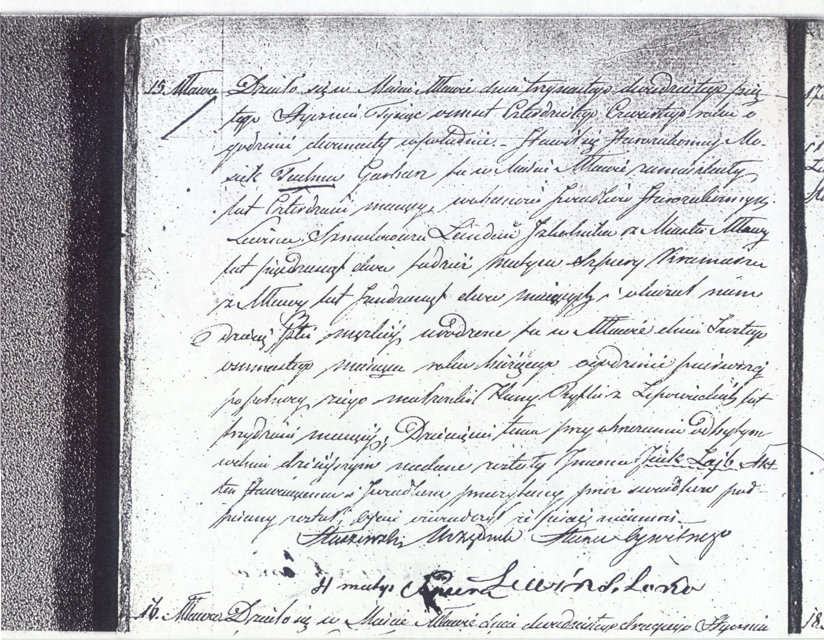 It happened in the town of Mlawa on the thirteenth/twenty fifth of January 1844 at twelve o’clock noon appeared Jew Moszek Tachna, a tanner residing in Mlawa forty years old and in the presence of Jewish witnesses Lewin Szmulowich Landau, teacher from Mlawa sixty two years old and presented to us a child of masculine gender born here in Mlawa on sixth/eighth of the current month and current year at one o’clock from his wife Hany Ryfki from Lipowich thirty years old.  Today at the circumcision ceremony the child was given the name Icik Lajb.  The document was read to the appearing witnesses and signed by them.  Father declared that he is illiterate.