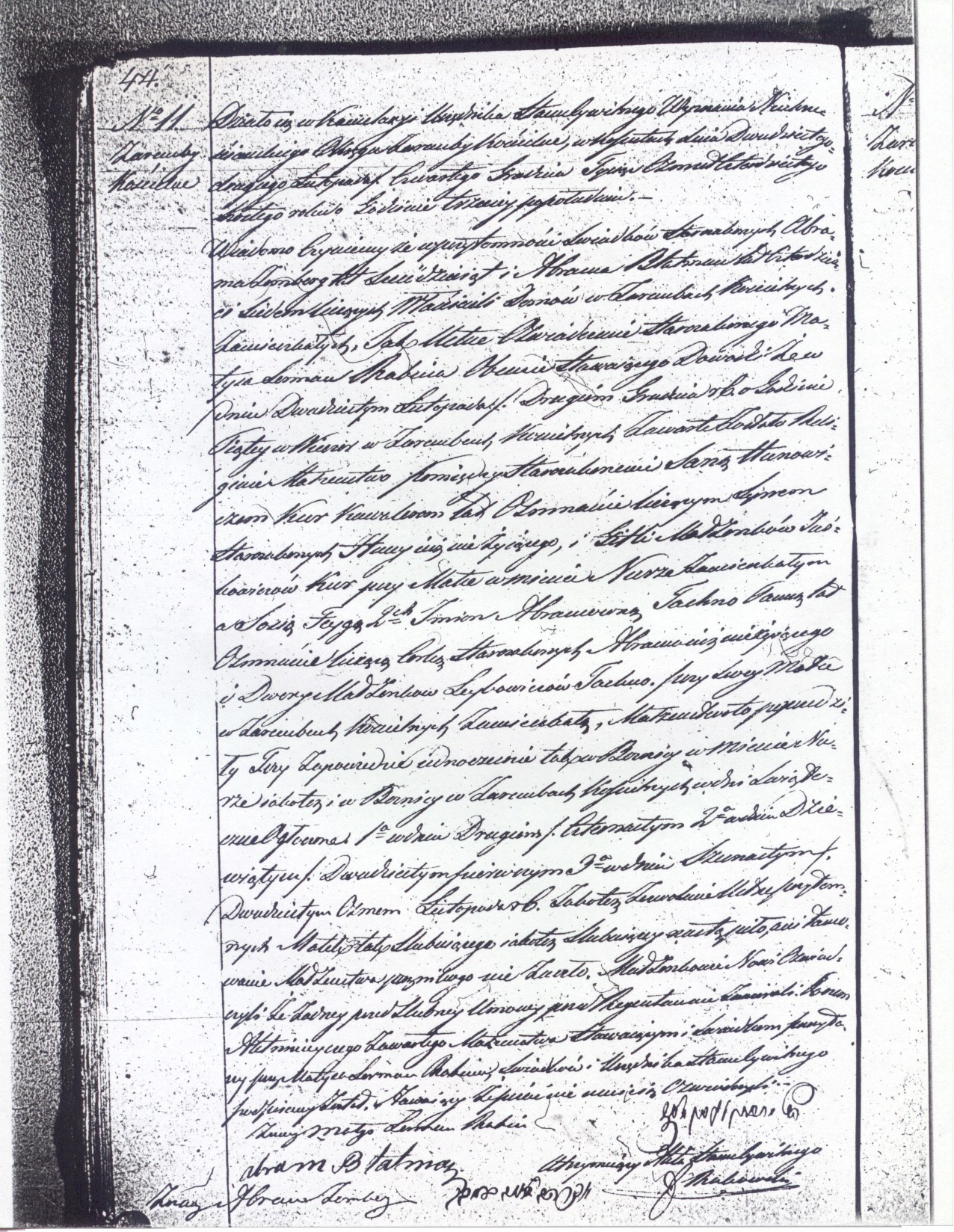 It happened in Kossuty in the rooms of the Civil Record Office for non-Christian religion of the district Zareby Koscielne on the twenty fourth of November/fourth of December, eighteen hundred forty six at three o’clock in the afternoon.  Being common practice, we notify that in the presence of the Jewish witnesses Abram Lemberg, age sixty, and Abram Blatman, age forty seven, both of whom are house owners residing in Zareby Koscielne, the Jew Matys Lerman, Rabbi, who appeared today, personally announced that in Zareby Koscielne on the twentieth of November/second of December of the current year at five o’clock in the evening was performed the religious wedding of the Jew Sana Hunowicz Kur, bachelor, age eighteen, son of the Jews Huna, deceased, and Gitla married couple Juskowicz Kur, living with his mother in the town of Nur, and Sosia Feyga, two given names, Abramowna Tachna, unmarried, age eighteen, daughter of the Jews Abram, deceased, and Dwora married couple Leybowicz Tachna, living with her mother, residing in Zareby Koscielne.  The wedding preceded three banns simultaneously in the synagogue of Nur and in the synagogue of Zareby Koscielne on the holidays of first, the second/fourteenth, second, the ninth/twenty first, and third, the sixteenth/twenty eighth of November of the current year, and that permission was given to this wedding personally by the mothers of the newly married, and that no obstruction against the marriage has occurred.  The newly married testified that they have not performed any premarital contract before the regent.  This marriage document was read to those who appeared and signed by Rabbi Matys Lerman, the witnesses and the Official of the Civil Registry Office, whereas the newly married testified that they cannot write.