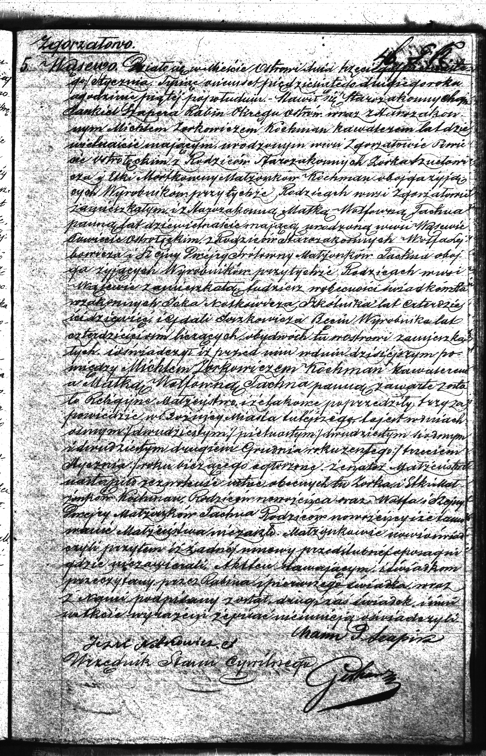 Wąsewo. It happened in the town of Ostrów on the third / fifteenth of January, eighteen hundred and fifty two at five o’clock in the afternoon. Appeared the Jew Chaim Jankiel Szapira, Rabbi of the Ostrów district, together with the Jew Michel Zorkowicz Kochman, bachelor, age nineteen, born in the village of Zgorzałów district Ostrołęka, son of his parents the Jews Zorko Szuelowicz and Etka Mortkówna, married couple Kochman, both of whom living, day laborers, living with these parents in the village of Zgorzałów, and the Jewess Małka Wolfówna Tachna, spinster, age nineteen, born in the village of Wąsewo, district Ostrołęka, daughter of her parents, the Jews Wolf Lejbowicz and Szejna Dwejra Srólówna married couple Tachna, both of whom living, day laborers, living with these parents in the village of Wąsewo, as well as in the presence of the witnesses, the Jews Ićko Notkowicz, synagogue sexton, age forty nine, and Gdala Joszkowicz Beem, day laborer, age forty eight, both of whom residing here in Ostrów, and declared that today before him between Michel Zorkowicz Kochman, bachelor, and Małka Wolfówna Tachna, spinster, was performed the religious wedding and that it preceded three banns that were announced in the synagogue of this town on the eighth / twentieth, fifteenth / twenty seventh and twenty second of December of last year / third of January of the current year. The here present Zorko and Etka married couple Kochman, parents of the groom and Wolf and Szejna Dwejra married couple Tachna, parents of the bride, gave their verbal permission to this marriage and no obstruction against this marriage occurred. The newly wed declared that they did not conclude any pre-marital contract before. This document was read to those who appeared and the witnesses, and together with us signed by the rabbi and the first witness, whereas the second witness and the newly wed declared that they cannot write.