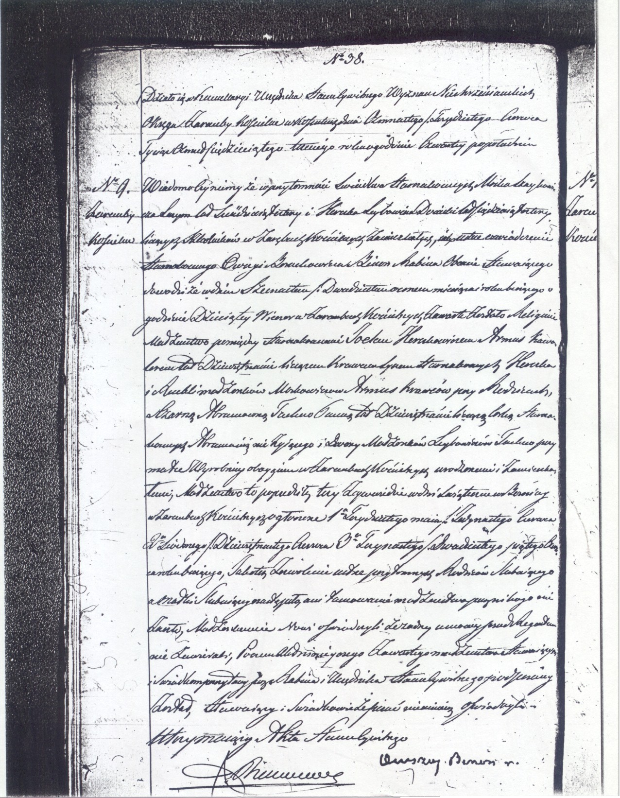 It happened in Kossuty in the rooms of the Civil Record Office for non-Christian religion of the district Zareby Koscielne on the eighteenth/thirtieth of June, eighteen hundred fifty three at four o’clock in the afternoon.  Being common practice, we notify that in the presence of the Jewish witnesses Mosko Szaykowicz Luzym, age sixty four, and Herszko Leybowicz Donicki, age fifty four, both of whom are synagogue sextons residing in Zareby Koscielne, the Jew Owszey Boruchowicz Binon, Rabbi, who appeared today, personally announced that in Zareby Koscielne on the sixteenth/twenty eighth of the current month and year at ten o’clock in the evening was performed the religious wedding of the Jew Joel Herszkowicz Armus, bachelor, age nineteen, tailor, son of the Jews Herszko and Ruchla married couple Moskowicz Armus, tailors, living with his parents, and Czarna Abramowna Tachna, unmarried, age nineteen, daughter of the Jews Abram [Avraham], deceased, and Dwora [Devorah] married couple Leybowicz Tachna, living with her mother, day laborer, both of whom born and residing in Zareby Koscielne.  The wedding preceded three banns in the synagogue of Zareby Koscielne on the holidays of first, the thirtieth of May/eleventh of June, second, the seventh/nineteenth of June, and third, the thirteenth/twenty fifth of June of the current year, and that permission was given to this wedding personally by the parents of the groom and the marriage has occurred.  The newly married testified that they have not performed any premarital contract before the regent.  This marriage document was read to those who appeared, and signed by the Rabbi and the Official of the Civil Registry Office, whereas the others here present testified that they cannot write.