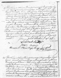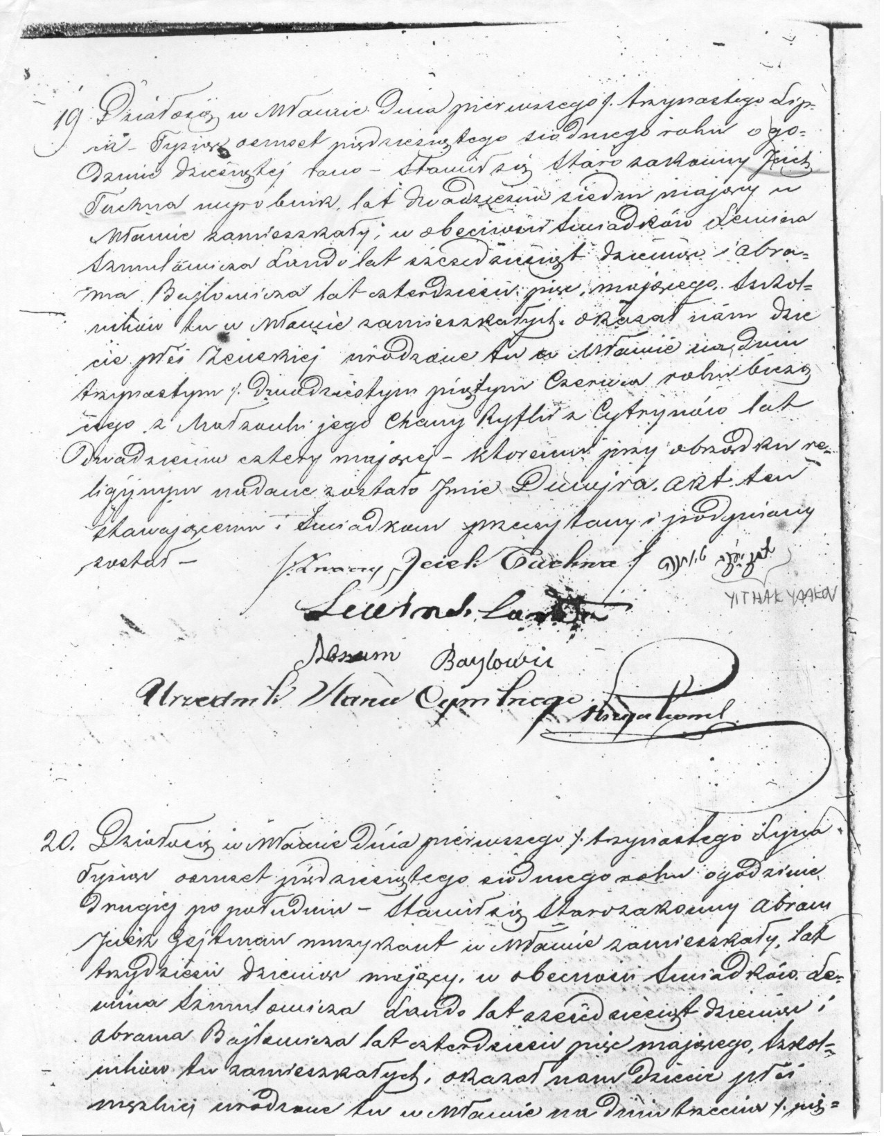 This happened in Mlawa the first day of thirteen July, eighteen hundred and fifty seven at ten o’clock in the morning.  It was presented to me from the Jew Ickiem Jakub [Yitzhak Yakov son of Yehuda Ha-Levy] Tachna, age twenty seven, living in Mlawa in company of witnesses Levin Szmulowicz Landau, age sixty nine, and Abram Bajlowixz, age forty five, both teachers living in Mlawa.  They show us a child, female, born here in Mlawa on twenty five June, eighteen hundred and fifty seven from the wife Chany Rifki [Channah Rivke daughter of Moshe Tzvi] Cytryn, age twenty four years.  The child was named according to the Jewish religion Dworja [Devorah daughter of Yitzhak Yakov Ha-Levy].  The act was written, read to everyone, and signed.