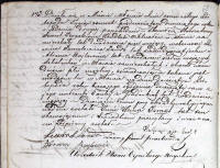 It took place in Mława on the eighteenth of November one thousand eight hundred and fifty nine at two o’clock in the afternoon.  Szmul Izraelowicz, a Jew, food peddler residing in Mława, age twenty five years old, appeared with Lewin Szmulowicz Lando, age seventy one years old, and Abram Bajlowicz, age forty seven years old, both Cheder teachers residing in Mława.  He showed us a baby boy, testifying that the child was born here, in Mława on the tenth of November this year, at nine o’clock in the morning, to his wife, Tauba née Gradacka, age twenty years old.  The child was named Huna Izrael. This document was read to the testifier and witnesses and signed by all of us.