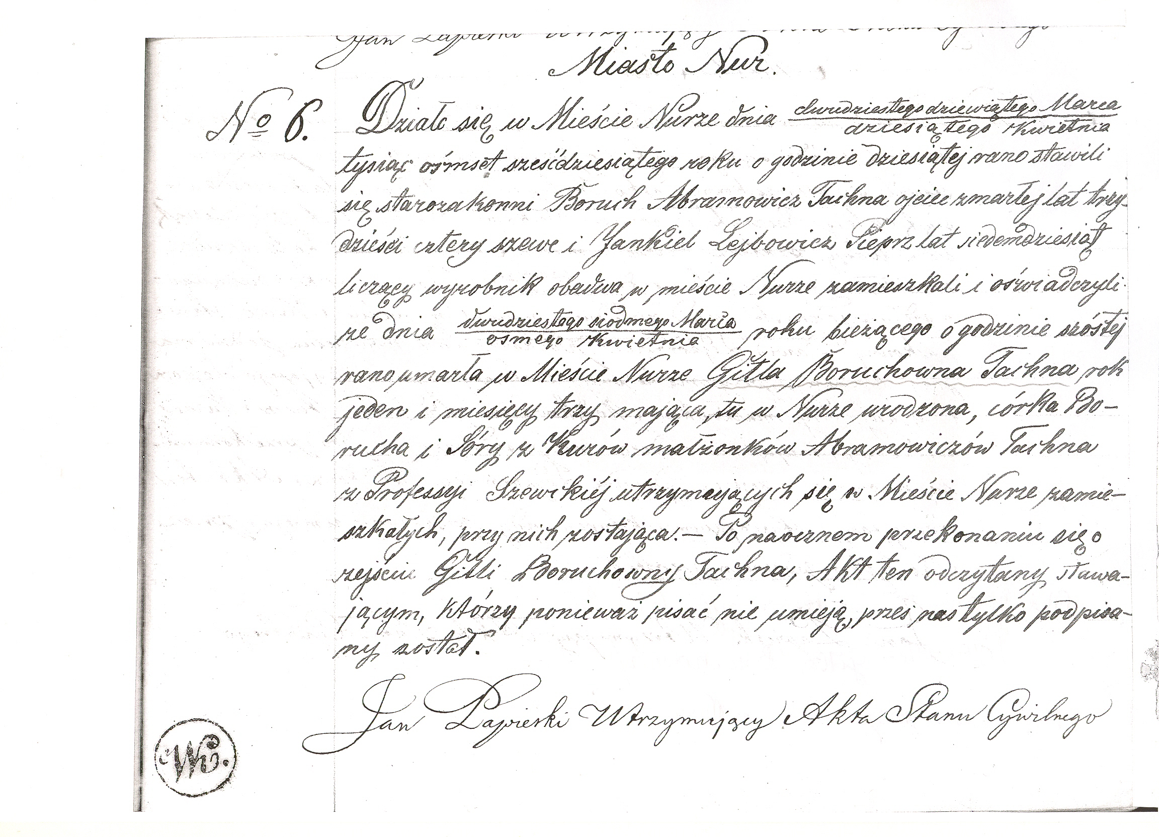 Boruch Abramowicz Tachna, a Jew, father of a deceased, age thirty