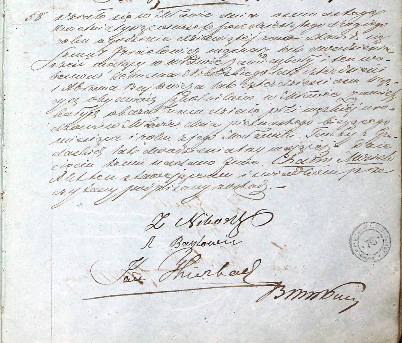 It took place in Mława on the eighteenth of April one thousand eight hundred and sixty two at nine o’clock in the morning.  Szmul Izraelowicz, grits and flour peddler, age twenty six years old, residing in Mława, appeared with Zelman Niborski, age forty years old, and Abram Bajlowicz, age forty eight years old, both Cheder teachers residing in Mława.  He showed us a baby boy, testifying that the child was born in Mława on the fifteenth of this month and year, to his wife, Tauba née Gradacka, age twenty three years old.  The child was named Chaim Mosiek.  This document was read to the testifier and witnesses and signed by all of us.