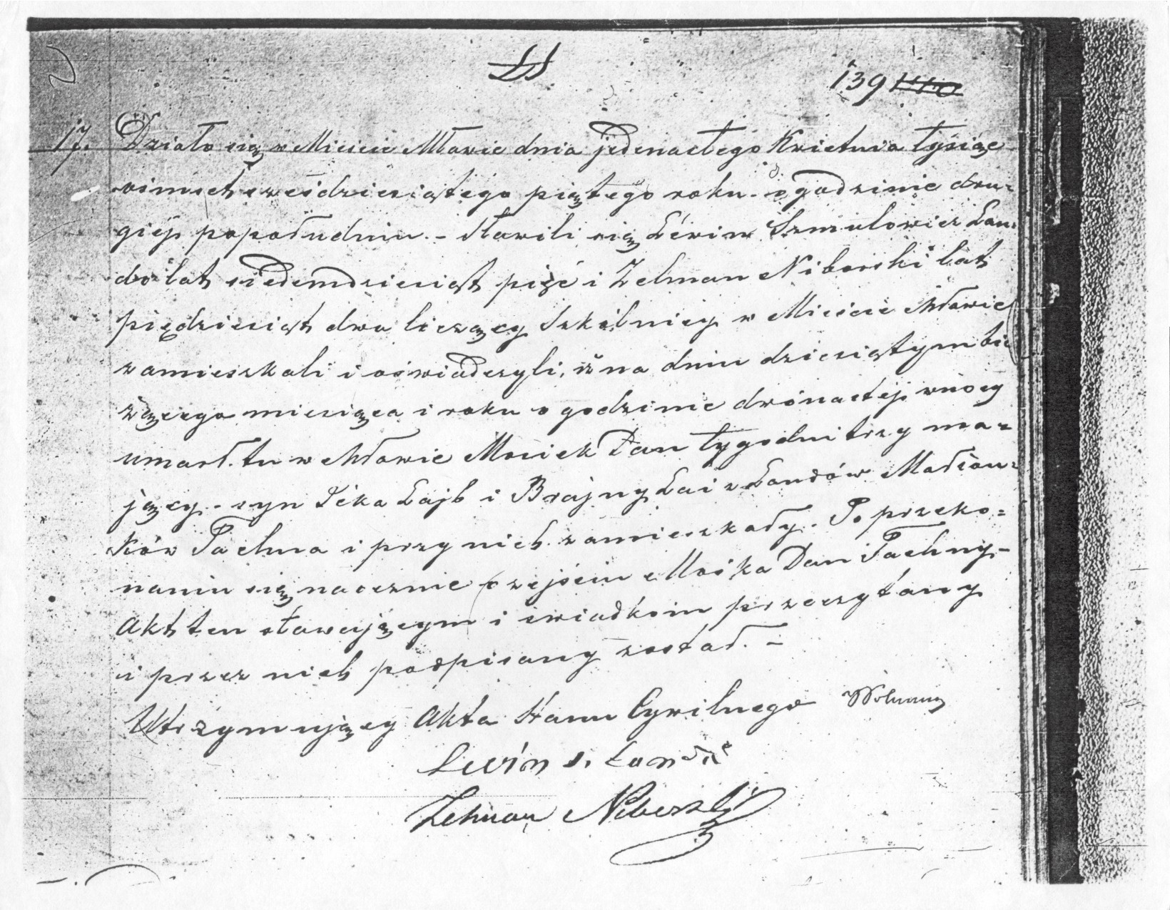 It happened in Mlawa eleven April, eighteen hundred and sixty five at two o’clock in the afternoon they came before me Levin Szmulowicz Landau, age seventy five, and Zalman Niborski, age fifty two, both teachers in the city of Mlawa, and they stated that on day ten of this month and year at twelve o’clock at night, died in Mlawa Moseik Dan [Moshe Dan son of Yitzhak Aryeh Ha-Levy], three weeks old son of Icek Lejb [Yitzhak Aryeh son of Moshe Mordechai Ha-Levy] and Brajna Laya [Brachah Leah daughter of Yisroel Eliezer Ha-Cohen], from maiden family Landau, both parents of name Tachna.  After seeing for certain to find out the child Mosiek Dan died, the act was seen and signed by those present.