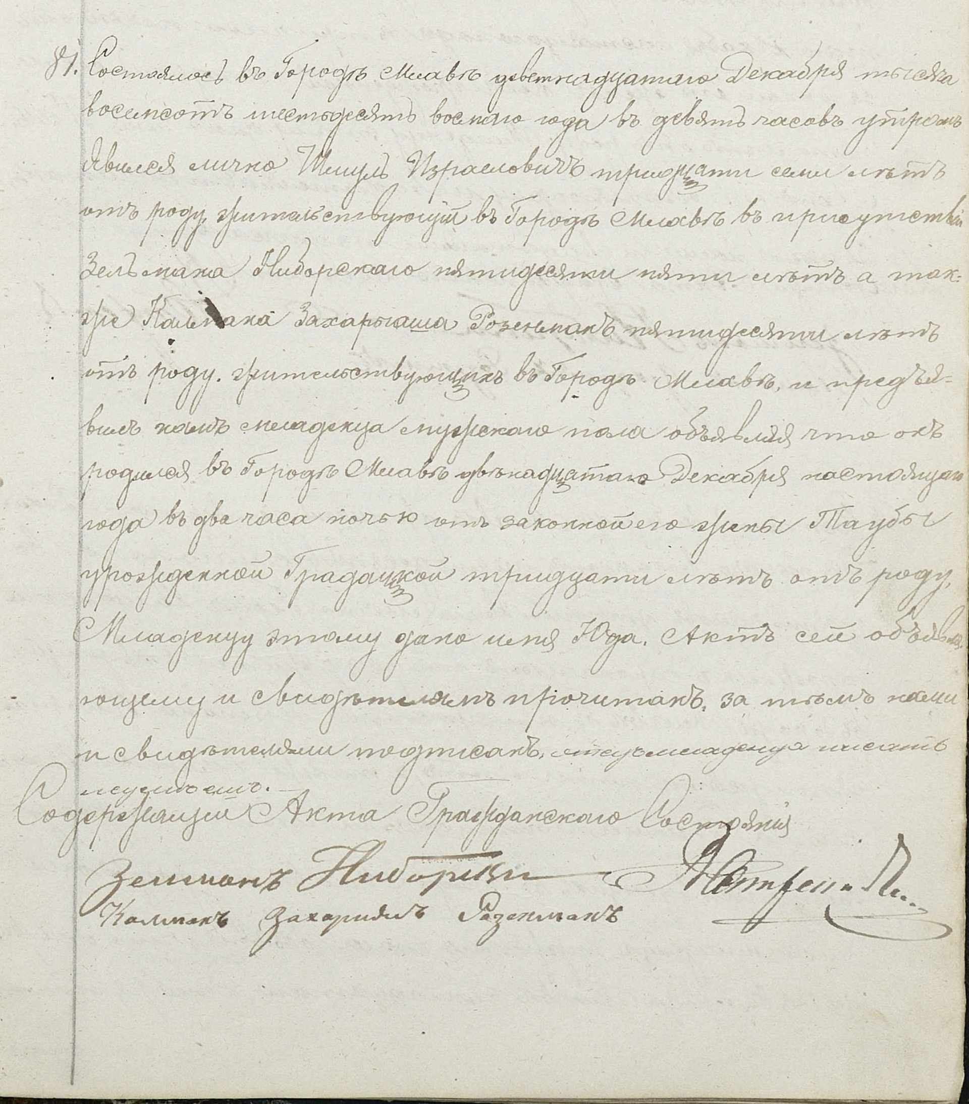 It took place in Mława on nineteenth of December one thousand eight hundred and sixty eight at nine o’clock in the morning.  Szmul Izraelowicz, age thirty seven years old, residing in Mława, appeared with Zelman Niborski, age fifty five years old, and also Kalman Zachariasz Rozenman, age fifty years old, [both] residing in Mława.  He showed us a baby boy, testifying that the child was born in Mława on the twelfth of December this year at two o’clock at night, to his wife, Tauba née Gradacka, age thirty years old.  The child was named Juda.  This document was read to the testifier and witnesses and signed by all of us except for the child’s father who is illiterate.