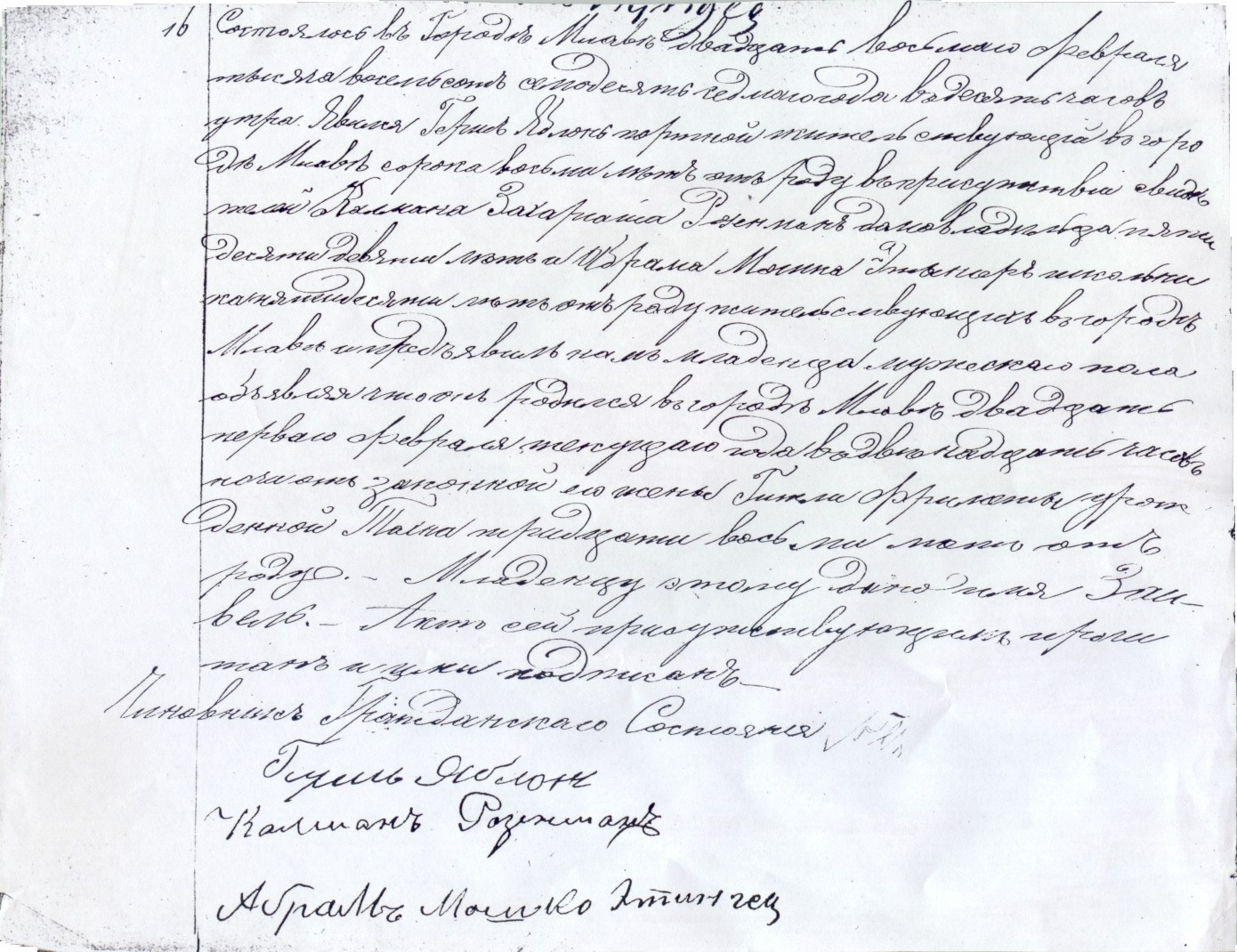 It happened in the town of Mlawa on the twenty eighth of February, eighteen hundred and seventy seven at ten o'clock in the morning. Hersz Jablon, tailor, residing in the town of Mlawa, forty eight years old, appeared in the presence of the witnesses, Kalman Zachariasz Rozenman, house-owner, fifty nine years old, and Abram Moszek Etynger, synagogue sexton, fifty years old, both of whom residing in the town of Mlawa, and presented us a child of male gender, testifying that it was born in the town of Mlawa on the twenty first of February of the current year at twelve o'clock at night to his wife, the Jewess, Gitla Frimeta née Tachna, thirty eight years old.  This child was given the name Zajwel.  This document was read to those who appeared and signed.