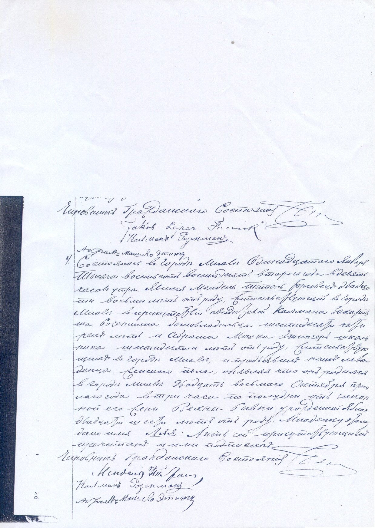 4.  It happened in the town of Mlawa on the eleventh of January, eighteen hundred and eighty two at nine o’clock in the morning. Mendel Tyton, trader, age twenty eight, residing in the town of Mlawa, appeared in the presence of the witnesses Kalman Zachariasz Rozenman, house owner, age sixty four, and Abram Moszko Etynger, synagogue sexton, age sixty, both of whom residing in the town of Mlawa, and presented us a child of female gender, stating that it was born in the town of Mlawa on the twenty eighth of October of last year at three o’clock in the afternoon to his wedded wife Wechna Rywka née Jablon, age twenty six. This child was given the name Laja. This document was read to those who appeared and signed by them.