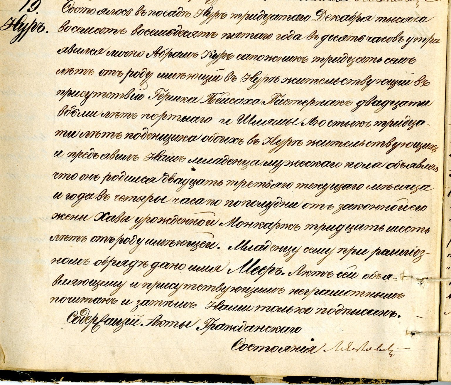 It took place in Nur, on December the thirtieth, eighteen hundred and eighty five, at ten o’clock in the morning.  Abram Kur, shoemaker, age thirty seven years old, residing in Nur, have appeared with Berszek Pejsach Pasternak, age twenty eight years old, a tailor, and Szlomo Lustyk, age thirty years old, a laborer, both residing in Nur.  He showed us a baby boy testifying the baby was born in on the twenty  third day of this month and year to his wife Chawa née Monkarz, age thirty six years old.  During the circumcision the baby was named Mejer.  This document was read to the illiterate testifiers and signed by us only.