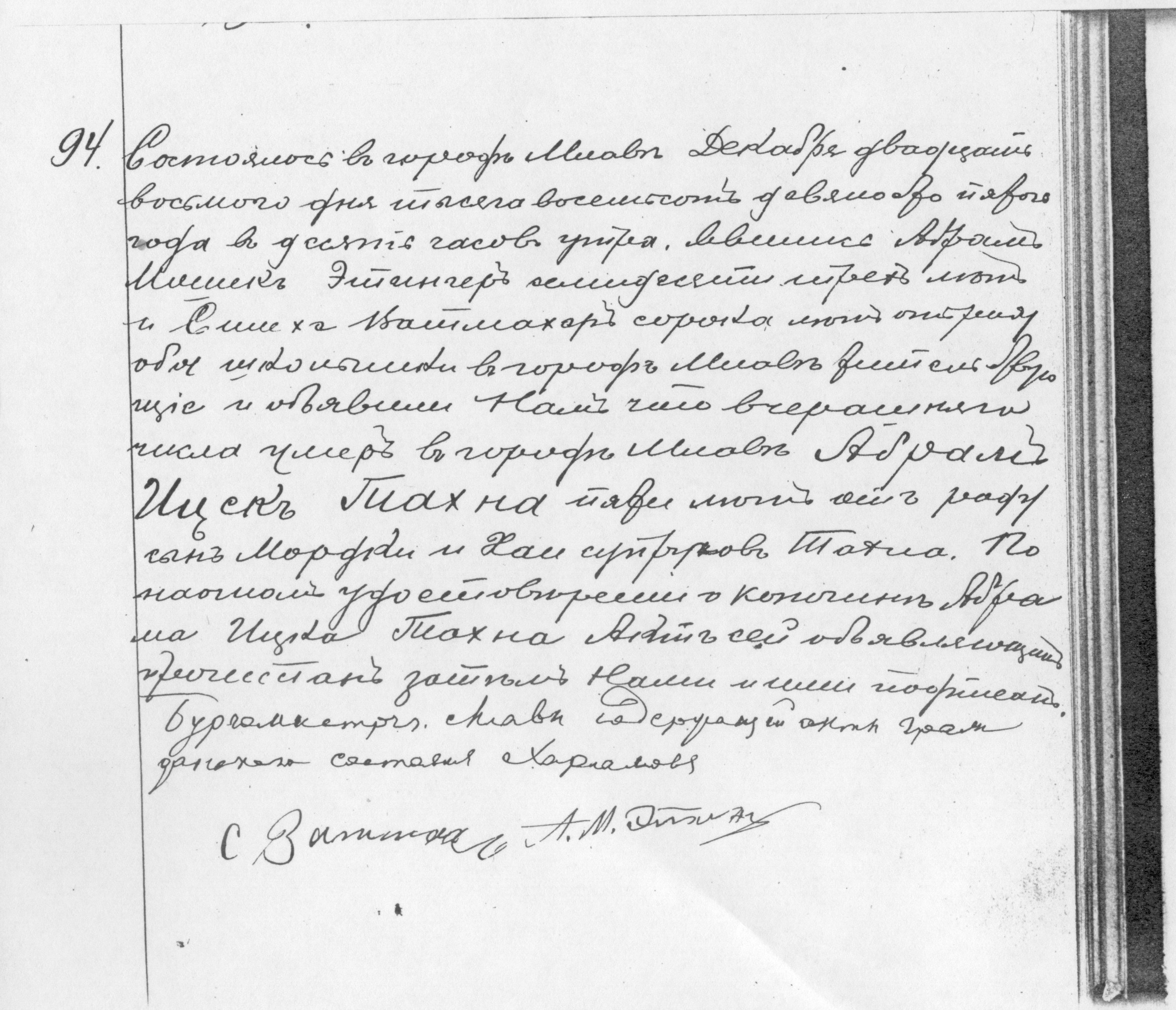 It happened in the town of Mlawa on the twenty seventh of October, eighteen hundred and ninety five at three o’clock in the afternoon. Rubin Mordka Tachna, shoemaker, age twenty nine, residing in the town of Mlawa, appeared in the presence of the witnesses Abram Moszek Etynger, age seventy three, and Symche Watmacher, age forty, both of whom synagogue sextons residing in the town of Mlawa, and presented us a child of male gender, declaring that it was born in the town of Mlawa on the twentieth of October of this year at eight o’clock in the evening to his wedded wife Chana née Kelman, age twenty nine. This child was given the names Abram Icek. This document was read aloud to the declarant and the witnesses and signed by Us and them.