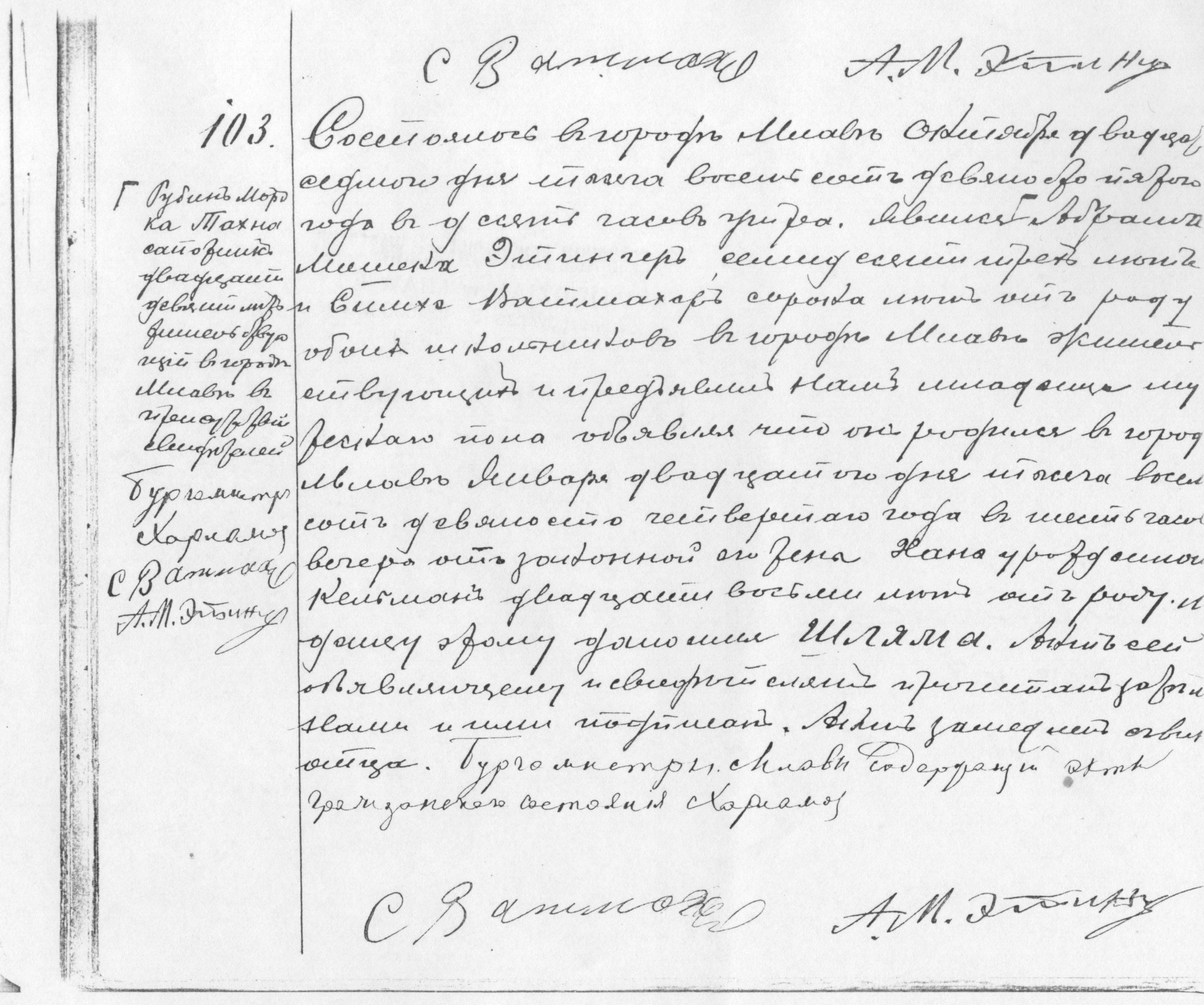It happened in the town of Mlawa on the twenty seventh of October, eighteen hundred and ninety five at ten o’clock in the morning. ┌ [in the margin] Rubin Mordka Tachna, shoemaker, age twenty nine, residing in the town of Mlawa, appeared in the presence of the witnesses ┐Abram Moszek Etynger, age seventy three, and Symche Watmacher, age forty, both of whom synagogue sextons residing in the town of Mlawa, and presented us a child of male gender, declaring that it was born in the town of Mlawa on the twentieth of January, eighteen hundred and ninety four at six o’clock in the evening to his wedded wife Chana née Kelman, age twenty eight and that it was given the name Szlama. This document was read aloud to the declarant and the witnesses and signed by Us and them. The father is to blame for the delay.