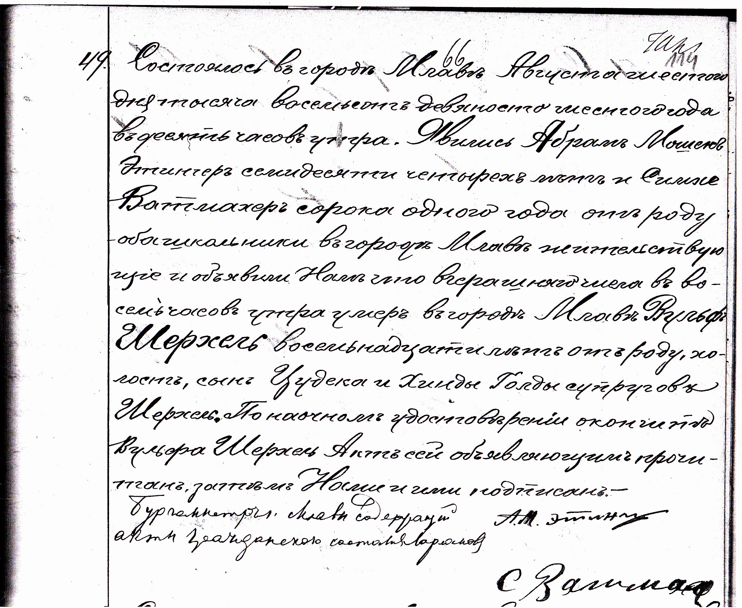 It took place in the town of Mława, on August the sixth, eighteen hundred and ninety six, at ten o’clock in the morning. Abram Moszek Etinger, age seventy four years old, and Symcha Watmacher, age forty one years old, both yeshiva teachers, residing in the town of Mława, have appeared testifying that Wulf Szerchel, age eighteen years old, bachelor, passed away yesterday in the town of Mława, at eight o’clock in the morning.  He was a son of Cudek and Hinda Gołda Szerchel.  We have confirmed the death of Wulf Szerchel.  This document was read to the testifiers and signed by all of us.