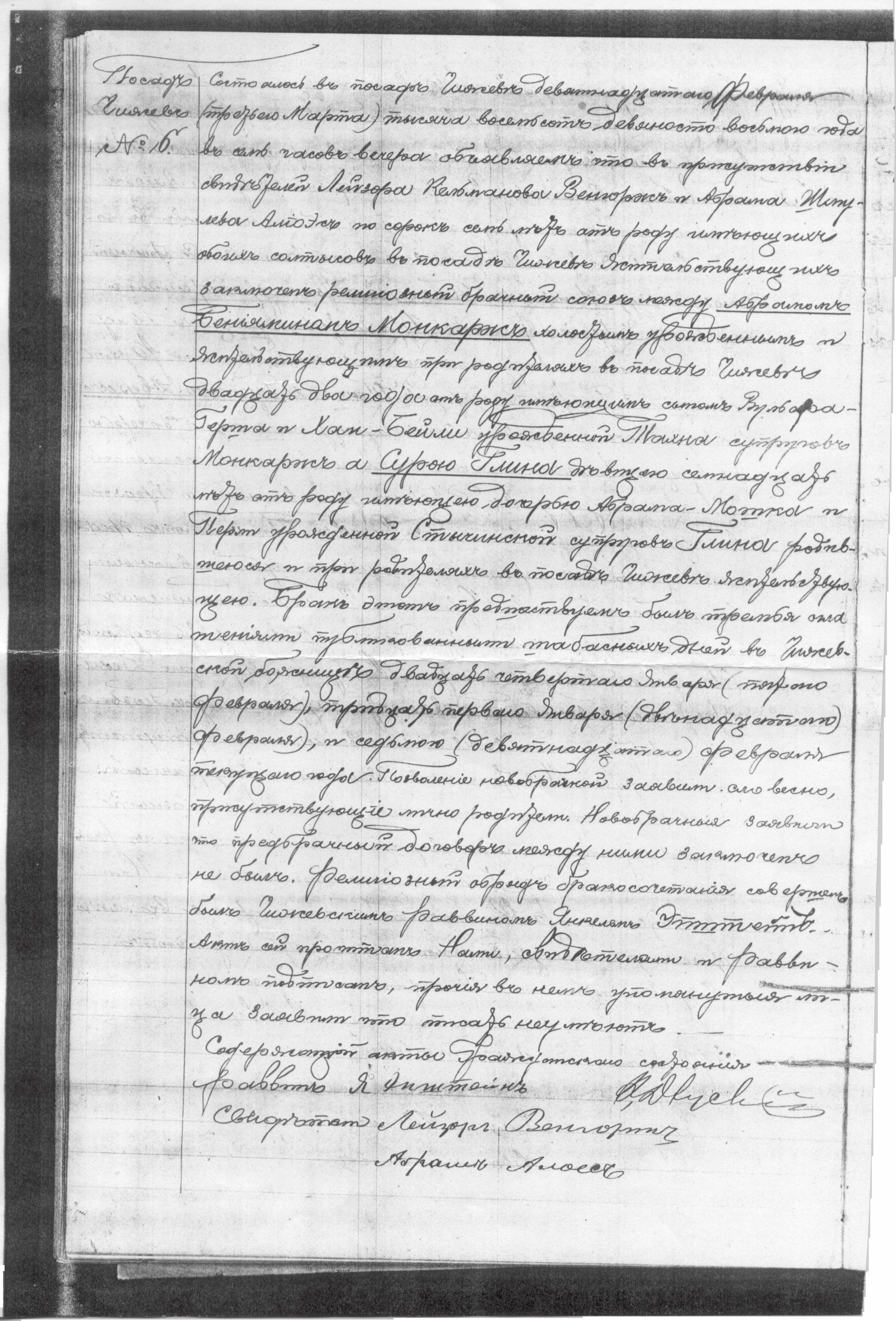 It happened in the settlement of Czyżew on the nineteenth of February (third of March), eighteen hundred and ninety eight at seven o’clock in the evening. I declare that [no date] in the presence of the witnesses Lejzer Kelmanow Wengorz [Węgorz] and Abram Szmulew Alioes, both forty seven years old and both of whom synagogue wardens residing in the settlement of Czyżew was performed the religious wedding between Abram Beniamin Monkarz [Mąkarz], bachelor, born and residing with his parents in the settlement of Czyżew, twenty two years of age, son of Wulf Hersz and Chaja Bejla née Tachna married couple Monkarz [Mąkarz], and Sura Glina, unmarried, seventeen years of age, daughter of Abram Moszek and Perla née Styczynska married couple Glina, born and residing with her parents in the settlement of Czyżew. The wedding preceded three banns that were announced in the synagogue of Czyżew on the sabbatical days of the twenty forth of January (fifth of February), thirty first of January (twelfth of February) and the seventh (nineteenth) of February of the current year. The parents of the newly married, who were personally present, gave their verbal permission to this wedding. The newly married declared that they did not conclude any pre-marital contract. The religious wedding ceremony was performed by the rabbi of Czyżew, Jankiel Epsztejn. This document was read aloud and signed by Us, the witnesses and the rabbi, the others mentioned in it stated that they cannot write.