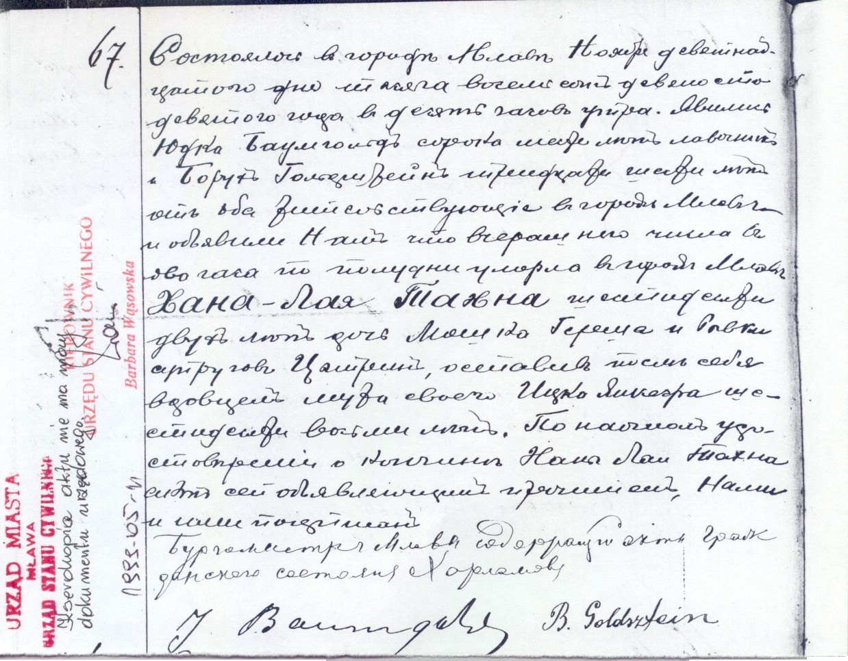 It happened in the town of Mlawa on the nineteenth day of November in the year eighteen hundred and ninety nine at ten o’clock in the morning. Judka Baumgold, age forty six, shop-keeper, and Boruch Goldsztejn, age thirty six, both of whom residing in the town of Mlawa, appeared and declared that yesterday at two o’clock in the afternoon Chana Laja [Channah Leah daughter of Moshe Tzvi] Tachna died in the town of Mlawa, age sixty two, daughter of the married couple Cytryn (Citrin), Moszek Hersz [Moshe Tzvi] and Rywka [Rivke], leaving behind her widowed husband Icek Jankief [Yitzhak Yakov son of Yehudah Ha-Levy], age sixty eight.  After having convinced ourselves with our own eyes about the death of Chana Laja Tachna, this document was read to the testifiers, signed by us and them.