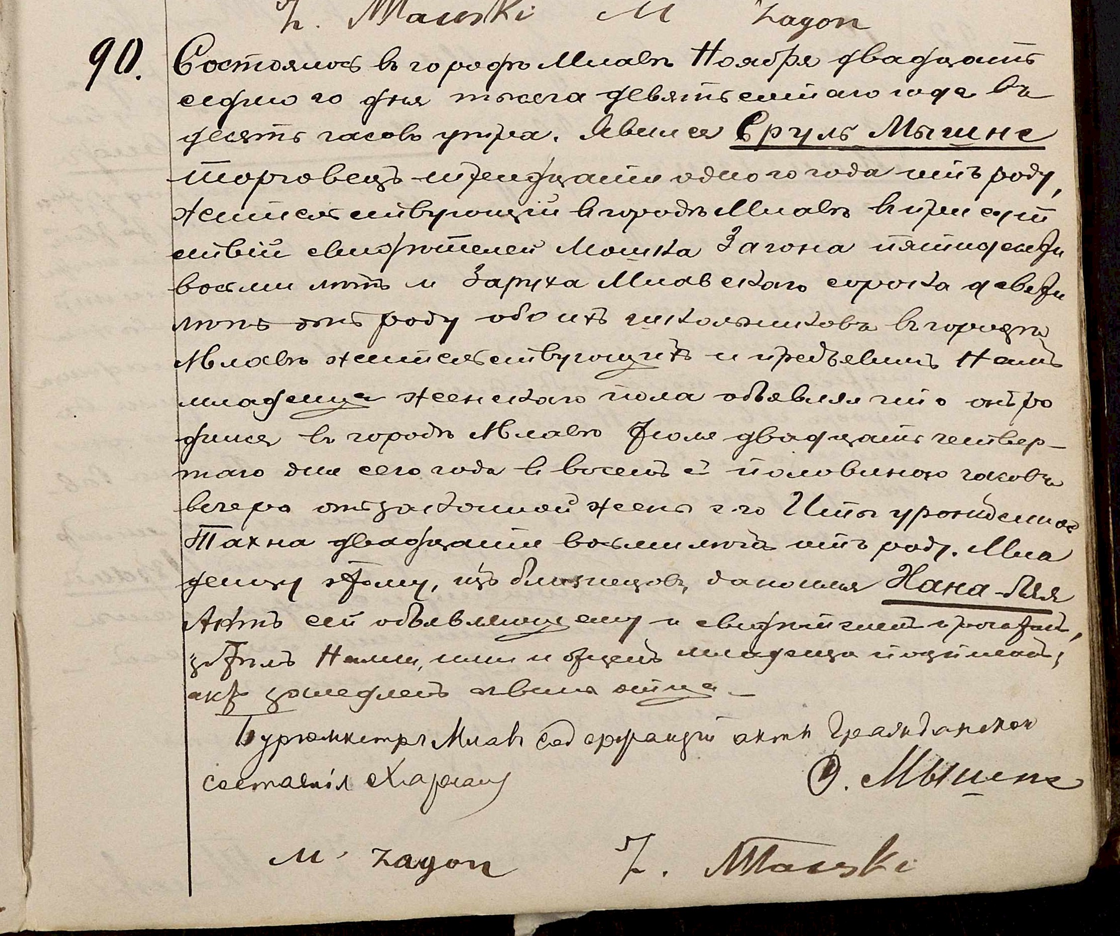 It took place in Mława on the twenty seventh of November one thousand nineteen hundred at ten o’clock in the morning.  Srul Myszne, peddler, age thirty one years old, residing in Mława, appeared with Moszek Zagon, age fifty eight years old, and Zaruch Mławski, age forty nine years old, both Cheder teachers residing in Mława.  He showed us a baby girl, testifying that the child was born in Mława on the twenty fourth of July this year at eight thirty in the evening, to his wife, Ita née Tachna, age twenty eight years old.  The child, [one] of twins, was named Chana Laja.  This document was read to the testifier and witnesses and signed by us, witnesses and child’s father.