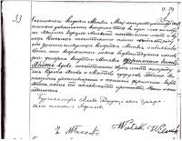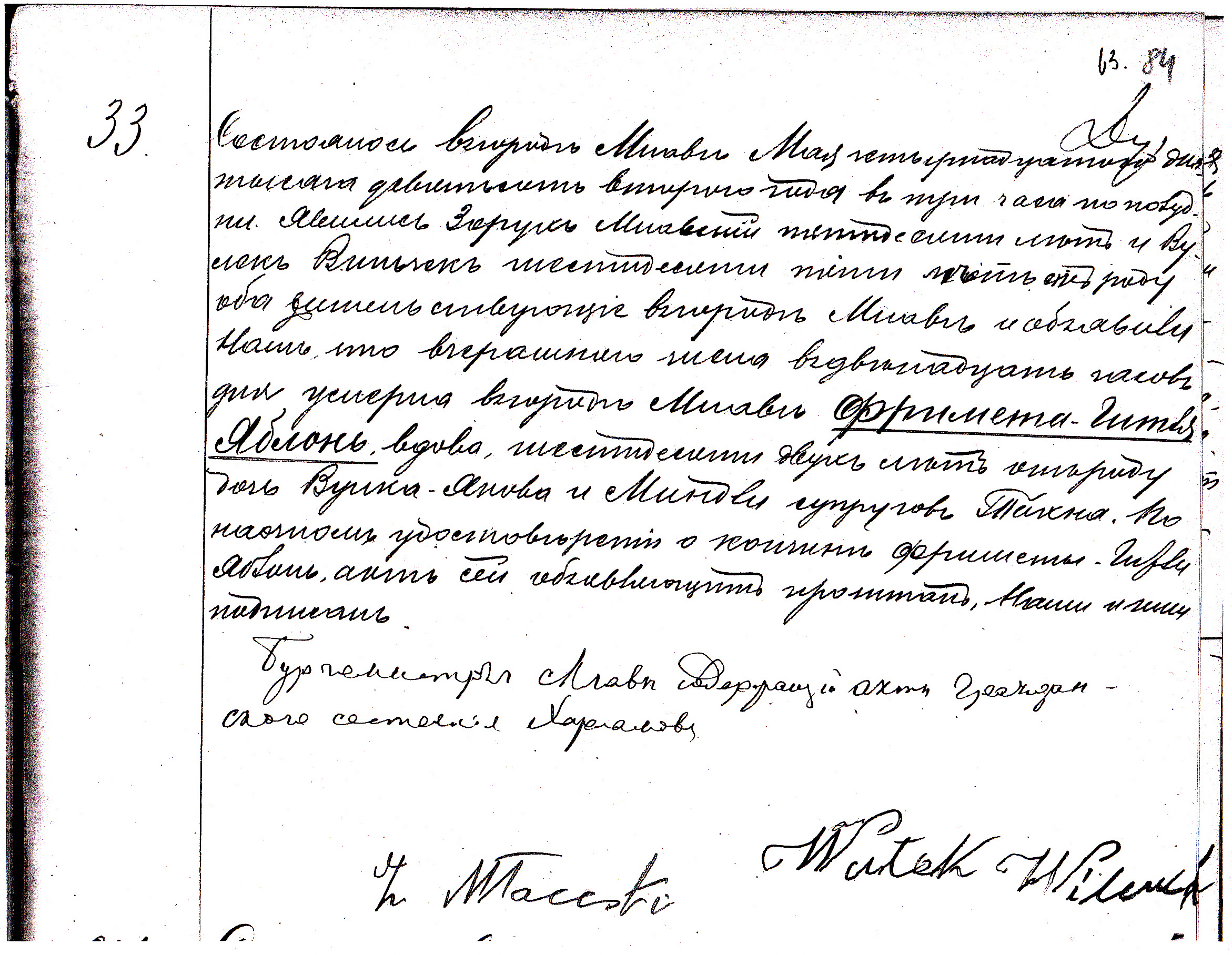 It took place in the city of Mława on May the fourteenth, nineteen hundred and two, at three o’clock in the afternoon. Zeruch Młaceski, age fifty years old, and Wułek Wileski, age sixty five years old, both residing in the city of Mława, have appeared testifying that Frymeta Gitla Jabłoń, a widow, age sixty two years old, daughter of Wułek Jakob Tachna and Mindla, passed away yesterday at noon.  We have confirmed the death of Frymeta Gitla Jabłoń.  This document was read to the testifiers and signed by us and them.