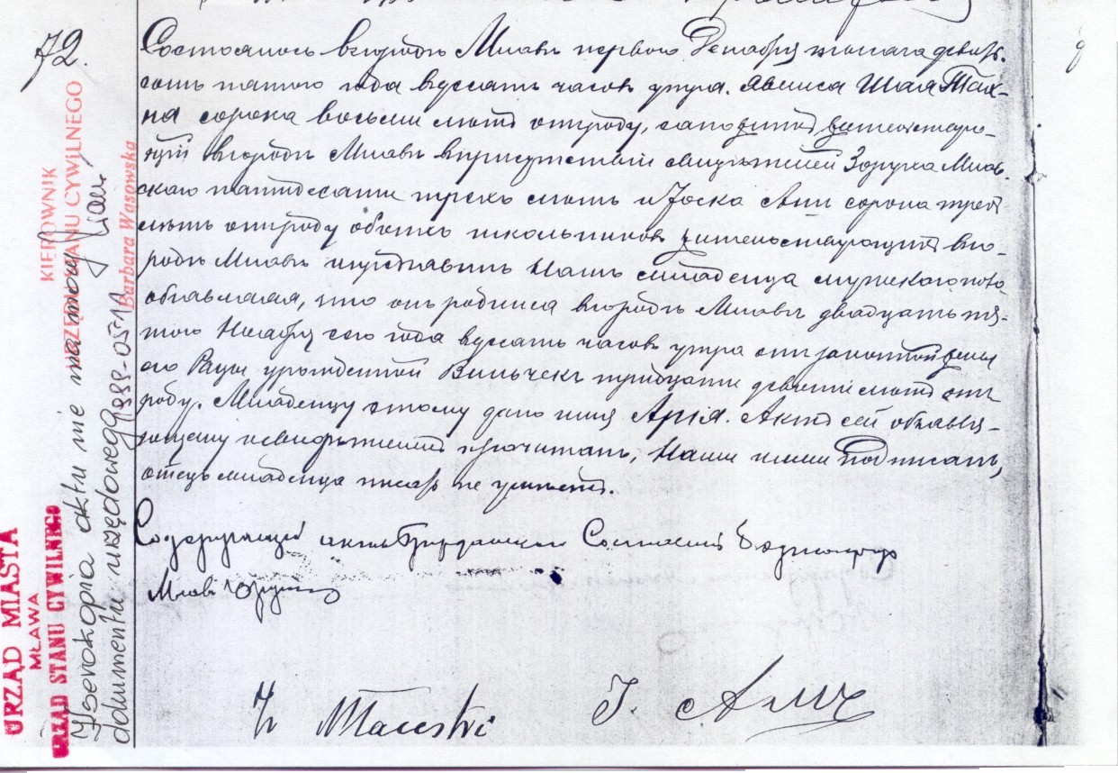 It happened in the town of Mlawa on the first day of December in the year nineteen hundred and five at ten o’clock in the morning.  Szaja [Yitzhak Yehoshuah son of Tzvi Aryeh Ha-Levy] Tachna, age forty eight, shoemaker, residing in the town of Mlawa, appeared in the presence of the witnesses Zoruch Mlawski, age fifty three, and Josek Asz, age forty three, both of whom synagogue sextons residing in the town of Mlawa, and showed us a child of the male gender, declaring that it was born in the town of Mlawa on the twenty fifth of November of the current year at ten o’clock in the morning to his wedded wife Raca [Ruchle daughter of Avram Yitzhak] née Wilczek, age thirty nine. The child was given the name Aria [Tzvi Aryeh son of Yitzhak Yehoshuah Ha-Levy].  This document was read to the testifier and the witnesses, signed by us and them, the father of the child cannot write.