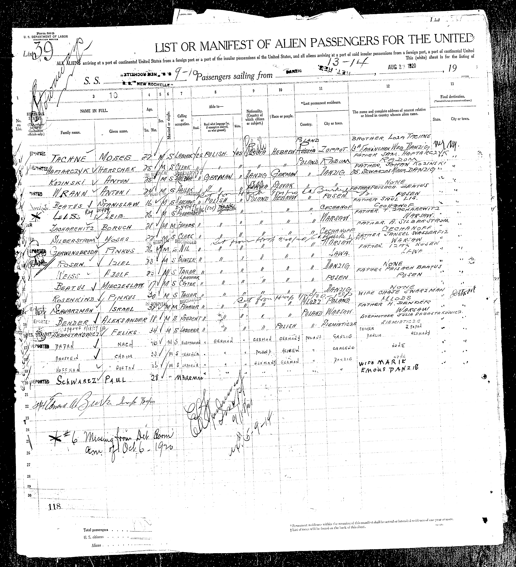 Arriving at Port of New York, September 17, 1920 |